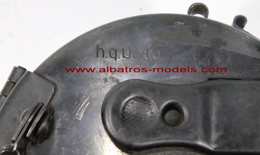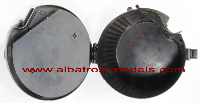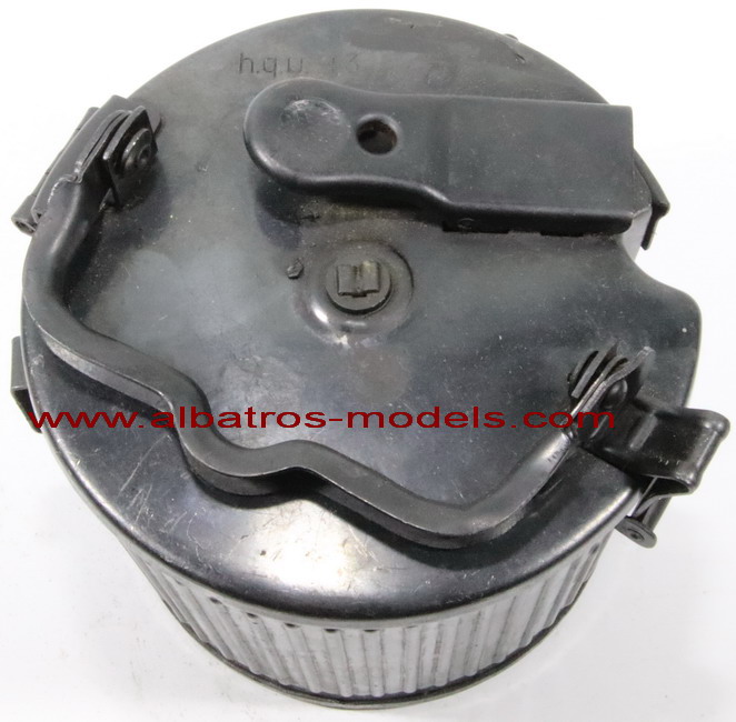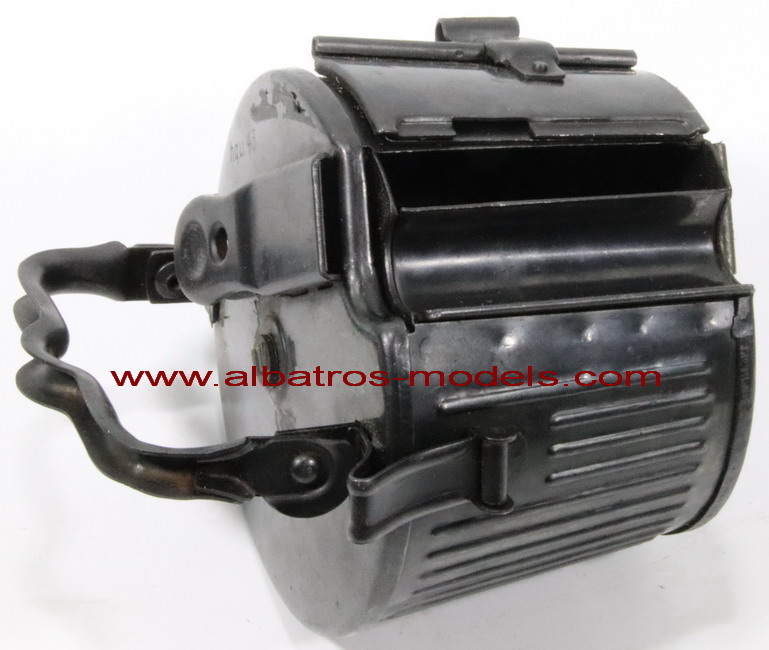 | Cargador de tambor con capacidad para 50 cartuchos calibre 7,92x 57, para dotación de las ametralladoras alemanas MG-34 y MG-42, este tipo de cargadores fueron diseñados para su uso cuando se utilizaba el arma para asalto y no tener que llevar la cinta de munición colgando y para evitar enganchones y tropiezos, aunque posteriormente también se utilizaron para su dotación en diversos vehículos como los Sdkfz 250 y 251 y los carros de combate. Normalmente estos cargadores se llevaban en un contenedor con capacidad para dos tambores denominado Gurtrommeltrager 34. El marcaje hqu corresponde al fabricante Markes & Co. KG Metallwarenfabrik u Apparantebau y 43 al año de fabricación |