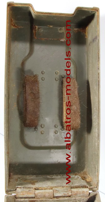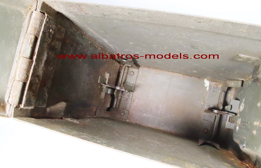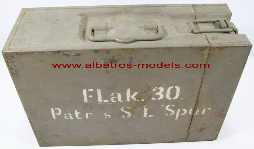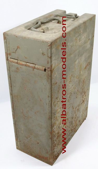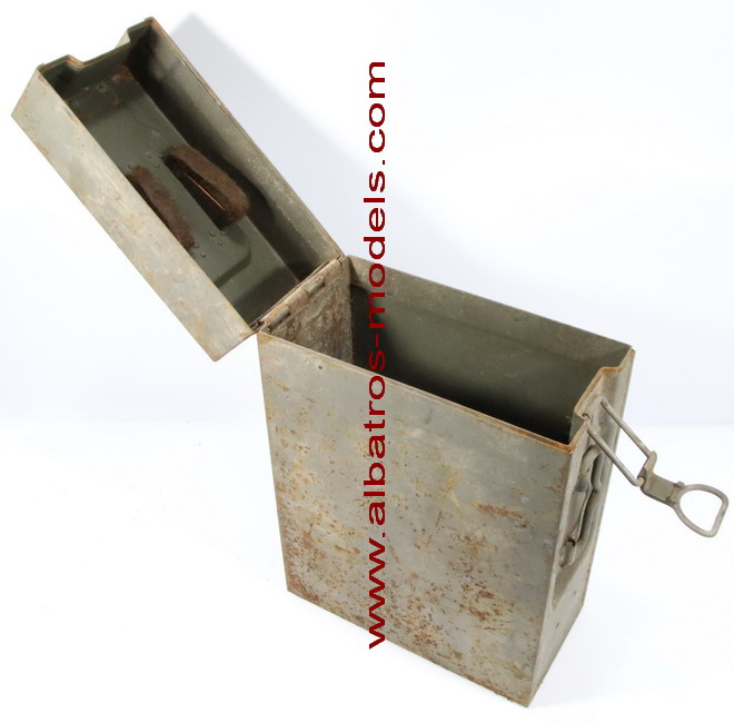 | Caja de metal con capacidad para dos cargadores del cañón Flak 30 y Flak 38, cada cargador tiene una capacidad de 20 cartuchos calibre 20x138 mm. La caja está fabricada enteramente de metal tipo chapa, con dos asas plegables colocadas en la parte superior y lateral. La tapa se cierra en un lateral mediante un cierre de palanca y con la bisagra de apertura en su parte contrapuesta. Dimensiones: 38 cms altura x 26 cms de largo x 13 cms de ancho. La parte interior de la tapa dispone de unos protectores de fieltro para evitar desplazamientos de los cargadores. Los cargadores se colocan de forma inversa a la carga, con lo tetones de sujeción, fijados a unos enganches colocados en la parte inferior de la caja. Por la procedencia posiblemente fueron utilizados durante la Guerra Civil Española. No se observan marcajes. |