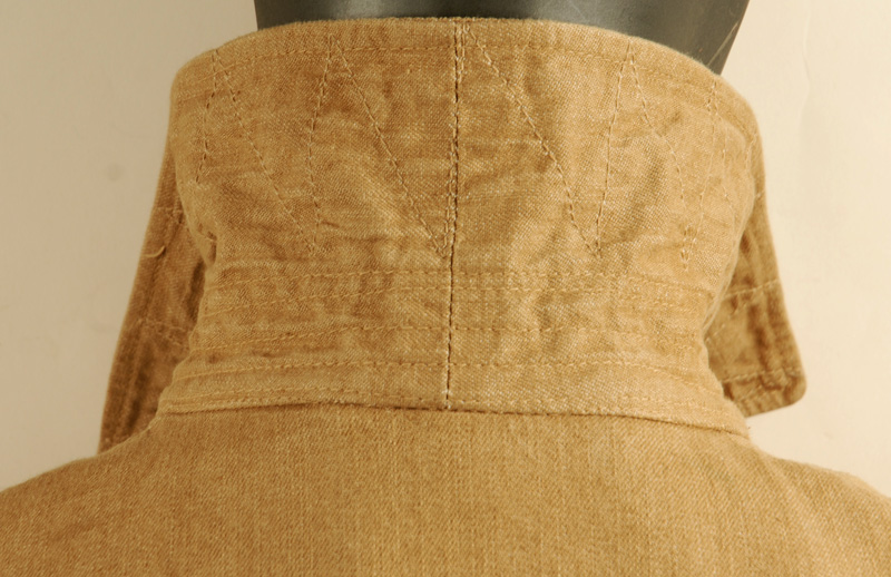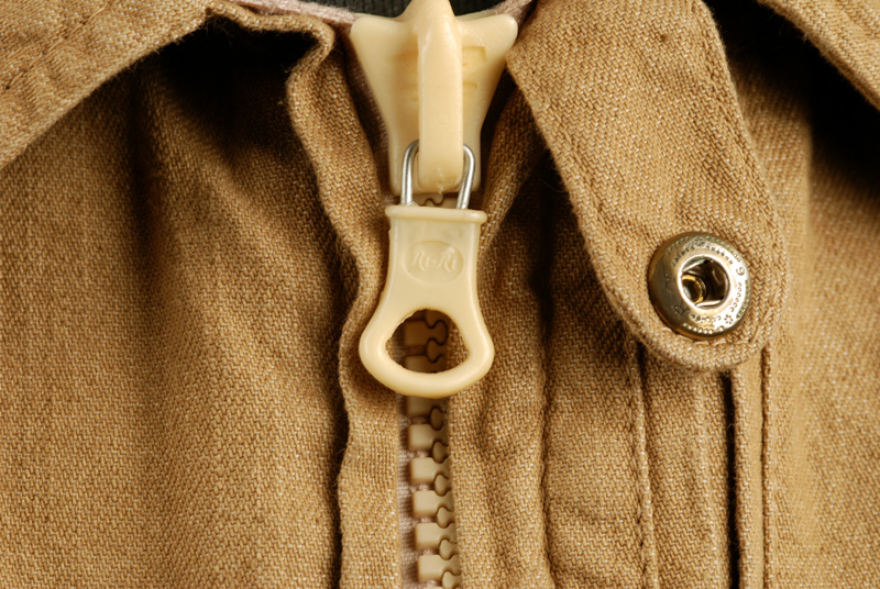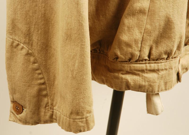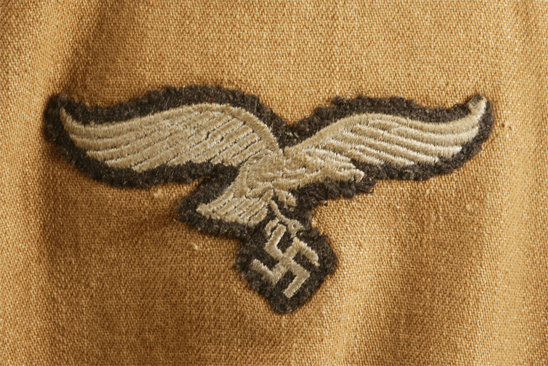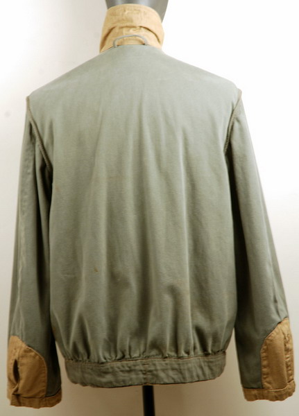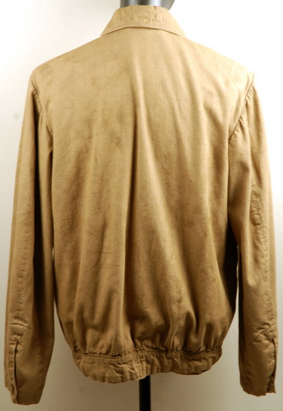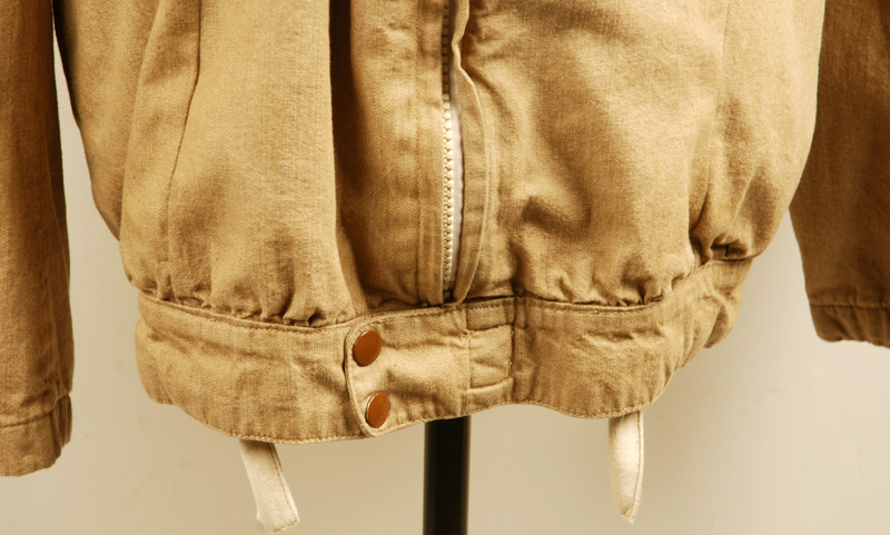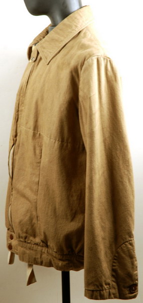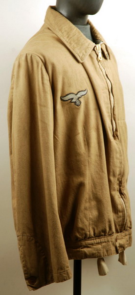 | Cazadora de vuelo para pilotos de la Luftwaffe, para su uso en climas tropicales / verano, esta confeccionada en tela de color marrón con la parte interior en color gris. Se cierra en su parte frontal mediante cremallera de baquelita blanca (que esta en buenas condiciones), para poder abrochar el cuello dispone de un remache regulable en dos posiciones. En el lateral izquierdo justo debajo del cuello tiene un amplio bolsillo, sin cierre, para guardar documentación, mapas y similares. En el lateral derecho lleva la insignia de la Luftwaffe, realizada en hilo blanco sobre una base azul y esta a su vez cosida a la chaqueta. La cazadora en su parte inferior también se pueda abrochar mediante dos remaches y ceñirse mediante una correa de tela colocada en su parte interior. |