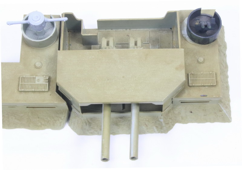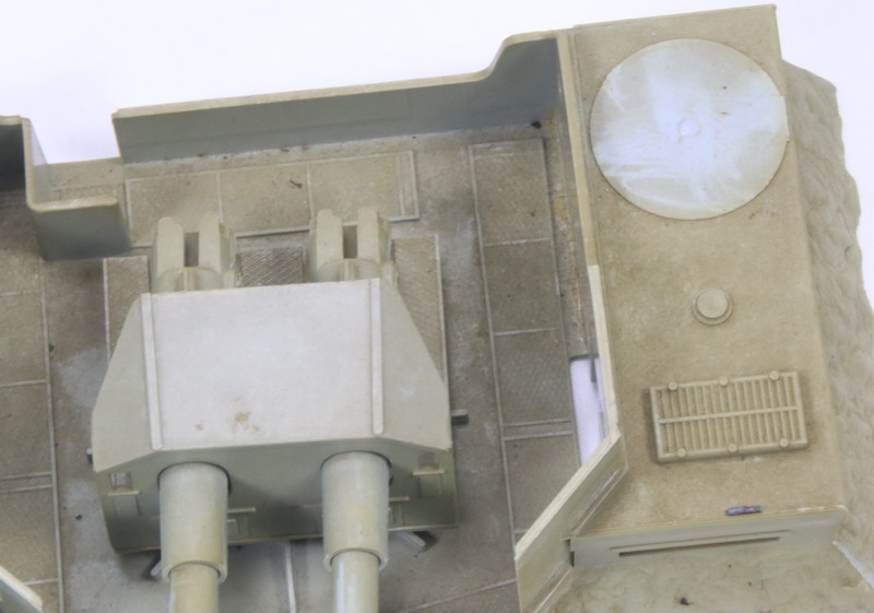 | Esta muy sucia de polvo, a una de las ametralladora dobles, le falta la parte final de los cañones y esta pintada, los dos pivotes de las torretas de las ametralladoras les falta el pivote de enganche, igual que al soporte de los cañones y creo que le falta la antena, ver fotos adjuntas |